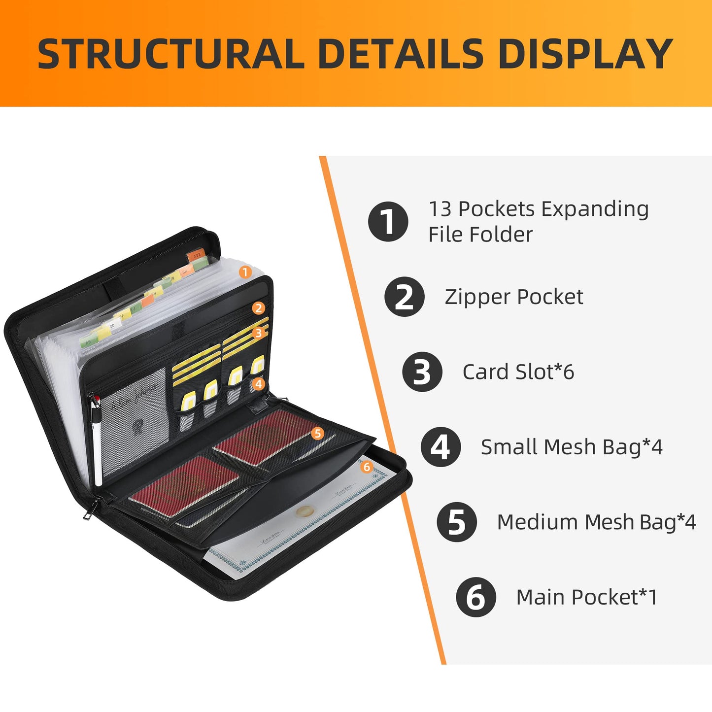 12-Pocket Expandable Fireproof Accordion File Organizer with Zipper and Tabs for Documents Storage